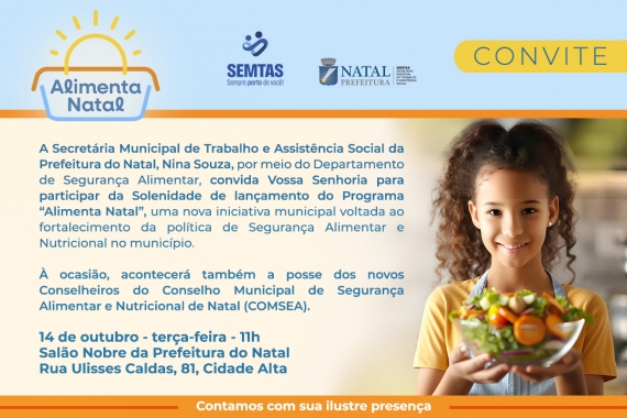 A Prefeitura do Natal lançará, na próxima terça-feira (14), o Programa Alimenta Natal, uma iniciativa da Secretaria Municipal do Trabalho e Assistência Social (Semtas) que integra e fortalece as políticas de segurança alimentar no município. O evento será realizado às 11h, no Salão Nobre da Prefeitura do Natal, e marcará também a posse dos novos conselheiros do Conselho Municipal de Segurança Alimentar e Nutricional (Comsea/Natal).