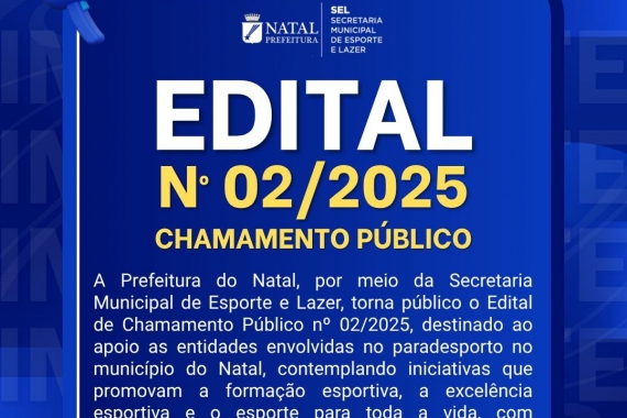 A Prefeitura do Natal, por meio da Secretaria Municipal de Esporte e Lazer (SEL), torna público o Edital de Chamamento nº 02/2025, destinado ao apoio financeiro a entidades que desenvolvem projetos voltados ao paradesporto no município de Natal.